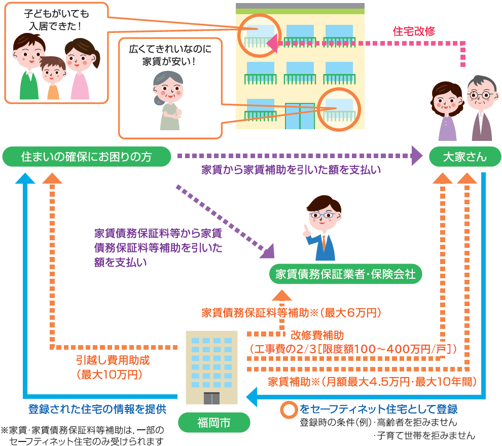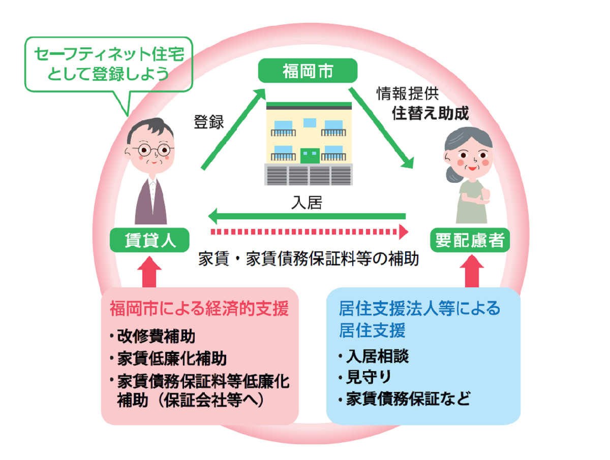 そこで福岡市では、住宅確保要配慮者の入居を拒まない民間賃貸住宅(=セーフティネット住宅)への改修費補助や、入居者負担の低減のための経済的支援を実施し、公的及び民間を合わせた賃貸市場全体による重層的かつ柔軟な住宅セーフティネットの機能強化を図ります。本事業を通して、人生100年時代、誰もが安心・安全に暮らすことができるまちづくりを進めていきます。